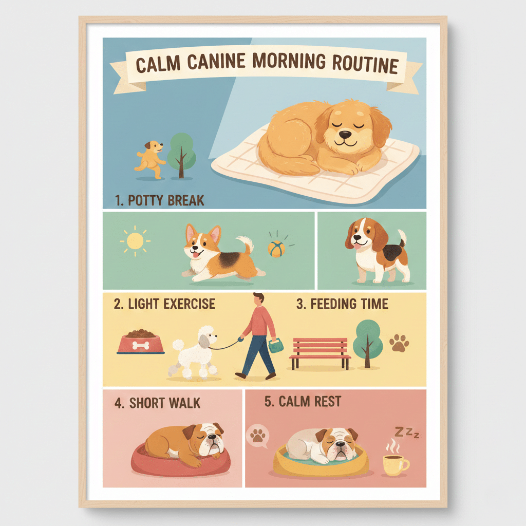 Dogs should get a short walk or active play session in the morning. Even 10–15 minutes helps: